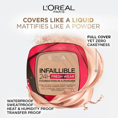 Product Description: Highlights: Mattifies with no cakeyness Covers and lasts like a liquid foundation Sweat-proof. Water-proof. Heat & Humidity Proof Medium to full coverage, buildable Overview: Discover the NEW Infaillible 24H Fresh Wear Foundation In A Powder by L'Oreal Paris which covers and lasts like a fluid, while mattifying with no cakeyness